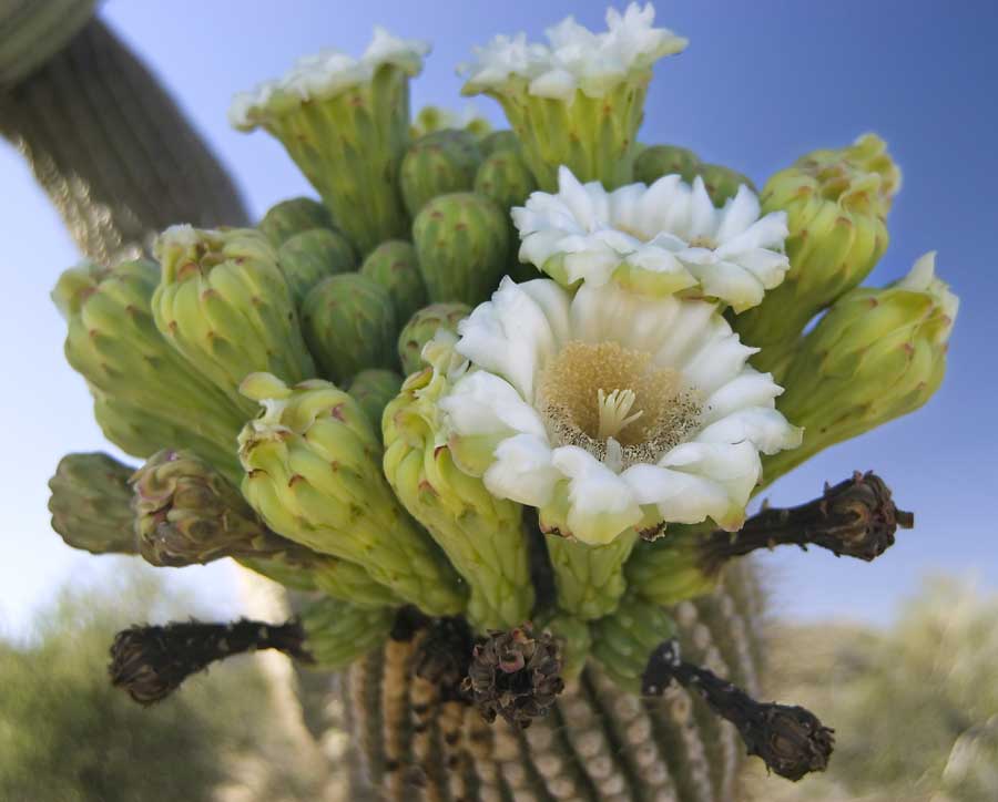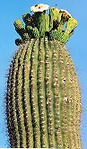 (Syn. Cereus giganteus) Long-lived, upright, branching, treelike cactus of the southwestern US.Prefers 15 inches or less rainfall. Waxy, white, 4 inch flowers rim the crown of this most classic of cacti, giving way to copious quantities of sweet, purplish fruit that is a significant source of diverse edibles (also providing an inebriating beverage) for the peoples of the Sonoran Desert. Difficult to harvest as cacti reach to 40 feet tall. Spines used traditionally for tattooing. Zerophytic, spiny plants prefer full sun, perfectly draining soils and little water. Cactus seed requires surface sowing and warm, humid conditions for germ–most growers stretch plastic over the top of the pot. Standard potting soils for cactus contain at least 50% pumice or coarse, sharp sand. Inoculate potting soil with soil taken from around other, established cacti. The soil surface should be very coarse (incorporate sharp gravel), in order to support sprouting seeds and keep them upright as they elongate and germinate. Sow in warm conditions. Expect spotty germ within 3 weeks, but some of the seeds may lie dormant for up to 2 years before germ. Keep seedlings partially shaded until they get big enough to (literally) prick out into roomier pots. Cacti may be gainfully cultivated indoors, in the unheated greenhouse, or of course in desert areas.