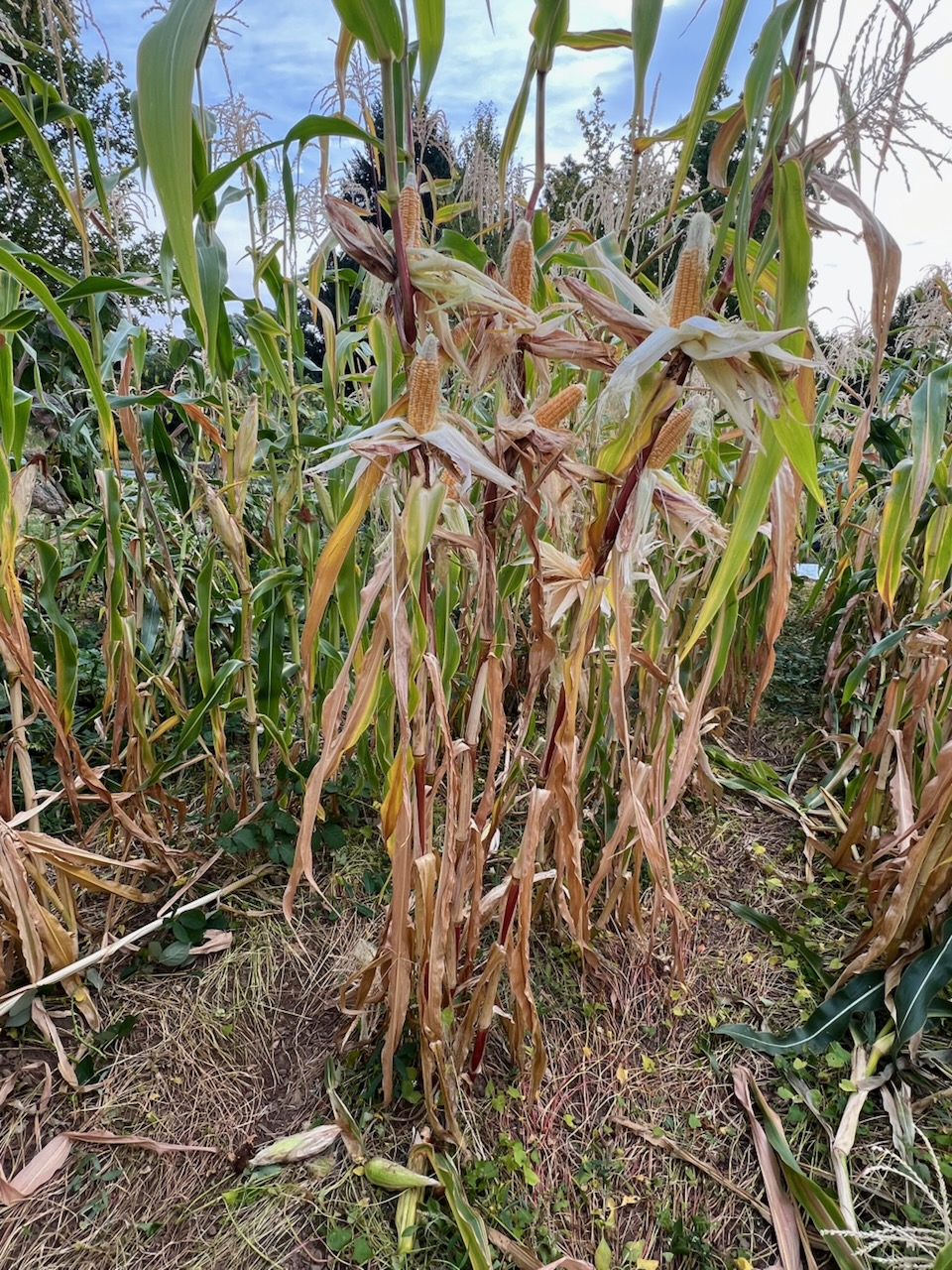 Annual. 80 days to maturity. Open-pollinated sweetcorn on powerful plants that produce up to 8 ears per plant on multiple stalks. “Improved” because we have accustomed the plant to growing in organic culture and chosen only the best ears for seed use, which improves overall vigor of the progeny (your plants, your corn, your sustenance). Space plenty far apart to allow for the plant to express this multi-stemmed habit and thereby produce more ears. I like to space the rows 3 feet apart and the plants 1 to 2 feet apart in the row. Corn bursting with broad, golden kernels. Excellent old-fashioned sweet corn flavor. This type is the original open-pollinated sweet corn and is preferred by many, which is partly due to the way it grows, and its general applicability to summer growing across the temperate zone. Also a matter of taste. This corn is sweet but not super-sweet. This leaves room to taste some corn along with your sugar. Can be planted in up to three successions for ongoing supply of excellent fresh corn for the table. Corn prefers rich soil and full sun, regular watering. Plant 1/2 inch deep and thin to 10 inches apart. Side dress with chicken manure after the plants attain 6 inches or so. Thin again to 1 to 2 feet apart, choosing the most robust plants for the keepers. Cultivate often to soften soil around plants and push the soil up around the stalks as they grow, to improve resistance to wind. After the plants reach knee high, you can cultivate and weed them one more time and then scatter crimson clover seed under them and water it in. This will cover the soil, feed the corn with nitrogen, and make it so you don’t have to weed again, all the way through to harvest.