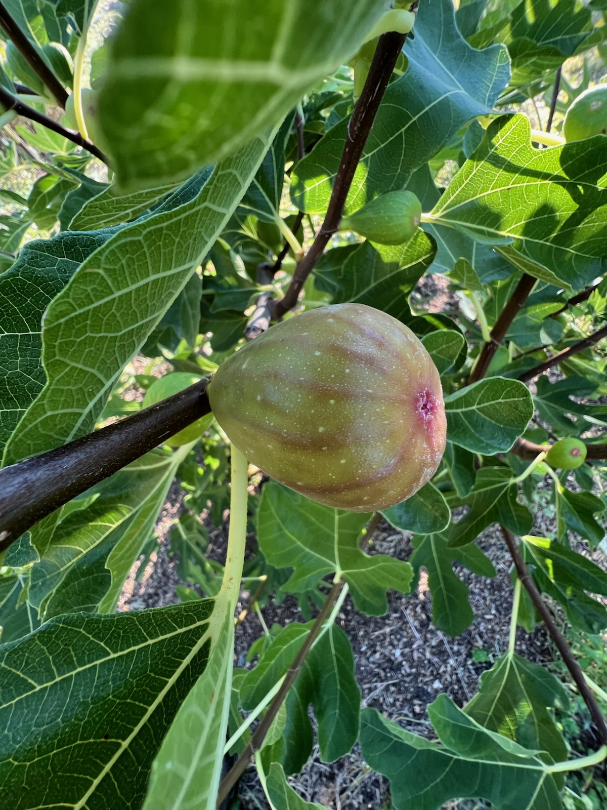 (Brown Turkey)  These plants are made from cuttings of a local tree that has proven itself extremely productive, robust, winter-hardy and self-fertile.  Woody perennial bush to small, spreading tree to 18 feet, producing voluminous purple fruits with light pink interior, sweet.  Figs may be eaten fresh or dried for later use.  There are 2 cycles of fruit produced, spring and fall.  Give figs full sun, fertile soil, a deep surface mulch of comfrey leaves, and water regularly, especially in the first year.   Space 15 feet apart.