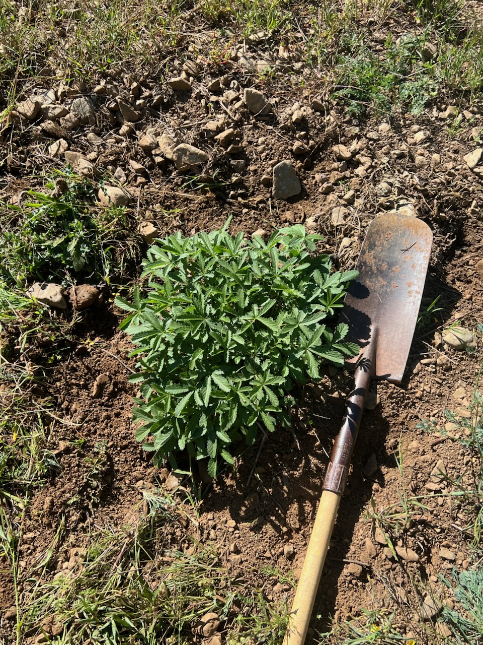 (Potentilla erecta, Cinquefoil) Herbaceous perennial native to Europe and temperate asia. A crown of yellow flowers graces a widely mounding plant. Both flowers and leaves are characteristic and handsome. The leaves are palmate in 5 lobes (like a human hand) and the flowers are bright golden yellow. Traditional use (TWM, TNAM): tea of roots used to treat bacterial diarrhea. Source of agrimoniin and other therapeutic tannins–trailside treatment for wounds. Plant likes full sun and moist garden soil. Sow in spring by pressing seed into surface and keeping moist until germ. Light dependent germinator. Space 1 foot apart. Flowers to 2 feet tall.