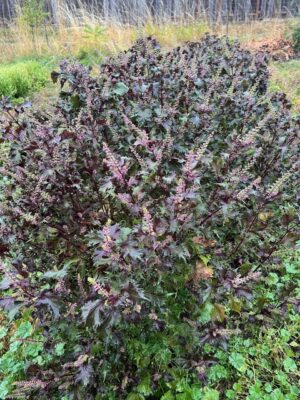 Erect, branching, evergreen shrub flowering to 6 feet tall, native to California and Southern Oregon. The long, lance-shaped leaves of this plant are coated with aromatic resin, making them sticky and shiny. They make a great offering when burned, and in fact the plant has much kharma with burning, as it likes to populate burned lands and the seed germinates best after a fire. Traditional usage of dried leaves (American Indian, TWM): cough, upper respiratory infection. The flowers are beautiful, purple/lavender tubes 1/2 inch long, ocurring in clusters at the top of the stems in the months of April through June. These nectarific flowers are adored by bees and other native pollinators. Plant prefers full sun and moderately fertile, slightly acidic soils, being most commonly found in dried waterways, rocky outcrops and trailside on south or east facing slopes. The plant is capable of producing offspring at a distance of up to 10 feet by means of underground runners, although this is likely to occur only where the plant is very well established. If spreading is not desired, restrict the roots. Yerba Santa can be a show plant for the herbal garden or botanical garden. Soak seeds overnight in willow tea, then plop little pinches of then down on surface of sandy soil in a flat and press in firmly, then keep warm and in the light and water only when the surface becomes dry, until germination occurs, which takes about 17 days. Individuate seedlings, pot up to larger pots and grow out for a year before transplanting to landscape. Space plants 3 feet apart.
