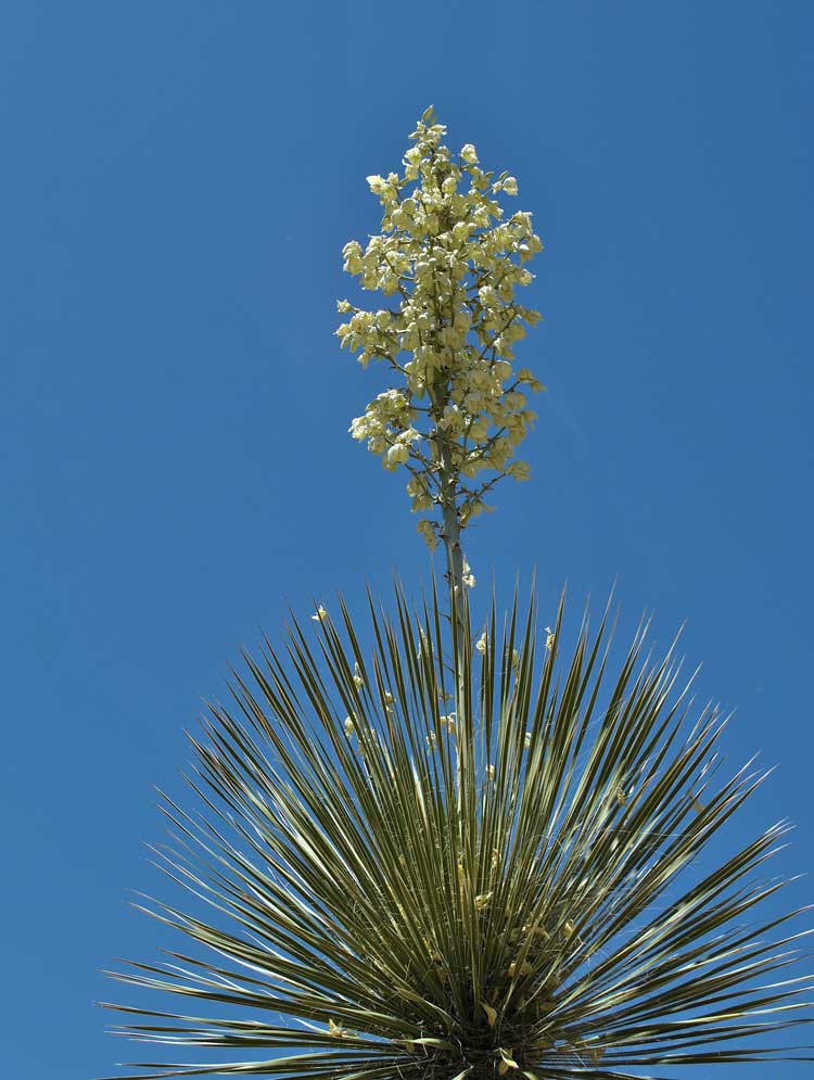 Xerophytic evergreen succulent tree Yucca that thrives in middle elevation in the American Southwest, especially the Chihuahuan desert, where it is native.  The plant produces a bristling globe of leaves atop the fleshy trunk.  The plant can grow as tall as 18 feet, although shorter individuals are far more common, dotted sporadically throughout the open desert and on fencelines throughout the wide range.  Flowering occurs sporadically, consisting of large clusters of creamy, bell-shaped flowers on a long plume that rises into the turquise skies of the SW. Both the trunk and the roots of the plant are loaded with saponins and have been used by native peoples as a source of fine soap.  Hair lathered up with yucca soap is hydrated and enlivened. Plant prefers full sun, fast draining soils and is extremely drought tolerant.  Sow seed flat, just below surface of cactus mix, and water daily and keep very warm and in the sunlight until germination, which is rapid. After germ, back off on watering and grow on seedlings until they attain sufficient size to pot up.  Transplant to landscape only after plants have reached sufficient size to fill a gallon pot with roots. Space plants 6 feet or more apart